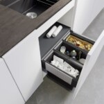 - Pri plánovaní treba zohľadniť výšku zabudovania košového systému, hĺbku drezu a z toho vyplývajúci min. rozmer pre spodnú skrinku.