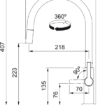 Otočná 360°. S vyťahovacou koncovkou osadenou perlátorom. Opletená sprchová hadica 150 cm. Pripojenie Hadičky 45 cm. Prietok vody 7,4 l/min. (3 bar). Laminárny prietok vody. Technológia pre úsporu vody.