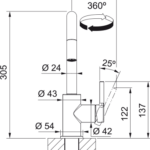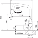 Otočná 360°. S vyťahovacou koncovkou osadenou perlátorom. S reguláciou Sprcha/Prúd. Opletená sprchová hadica 150 cm. Pripojenie Hadičky 45 cm. Prietok vody 8,5 l/min. (3 bar).