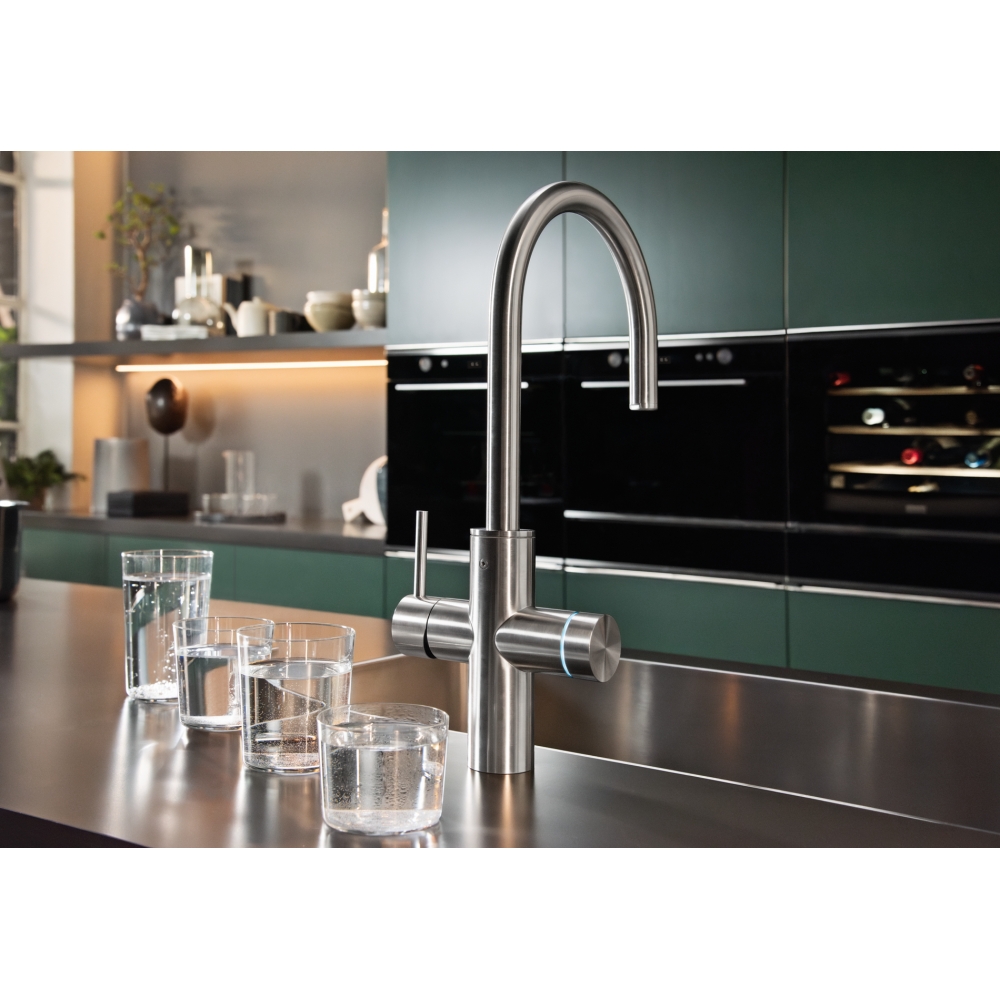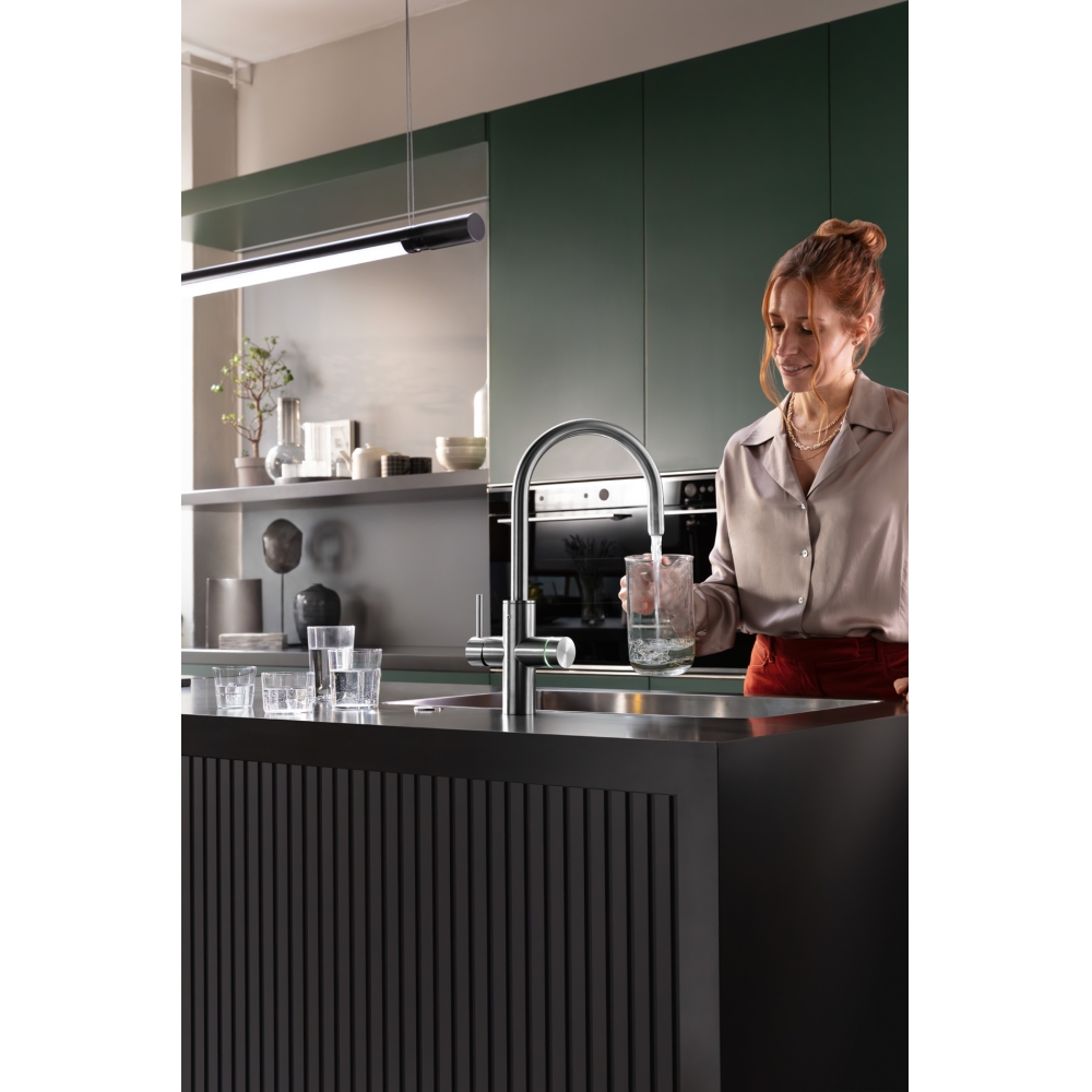 Batéria Mythos Water Hub Sparkling je inovatívne riešenie „všetko v jednom“, ktoré umožňuje výber vami preferovanej vody. Môžete si kedykoľvek vybrať medzi horúcou a studenou vodou. Ponúka tiež možnosť vody filtrovanej, ktorá môže byť chladená alebo perlivá. Bojler, chladiaca jednotka, kartuše CO2 a filter sú umiestnené v jednom kompaktnom boxe, čo umožňuje jednoduchú inštaláciu pod drez. Elektronické ovládanie s LED indikáciou a mobilné aplikácie uľahčujú obsluhu a sledovanie spotreby. Filter Pro M Connect obmedzuje tvorbu vodného kameňa, odstraňuje škodlivé kontaminanty, zachováva zdravé minerály, ako je vápnik a horčík. Vďaka integrovanej technológii RFID (Diaľková rádiofrekvenčná identifikácia) zariadenie automaticky zašle užívateľovi upozornenie, keď je potrebné filter vymeniť.
