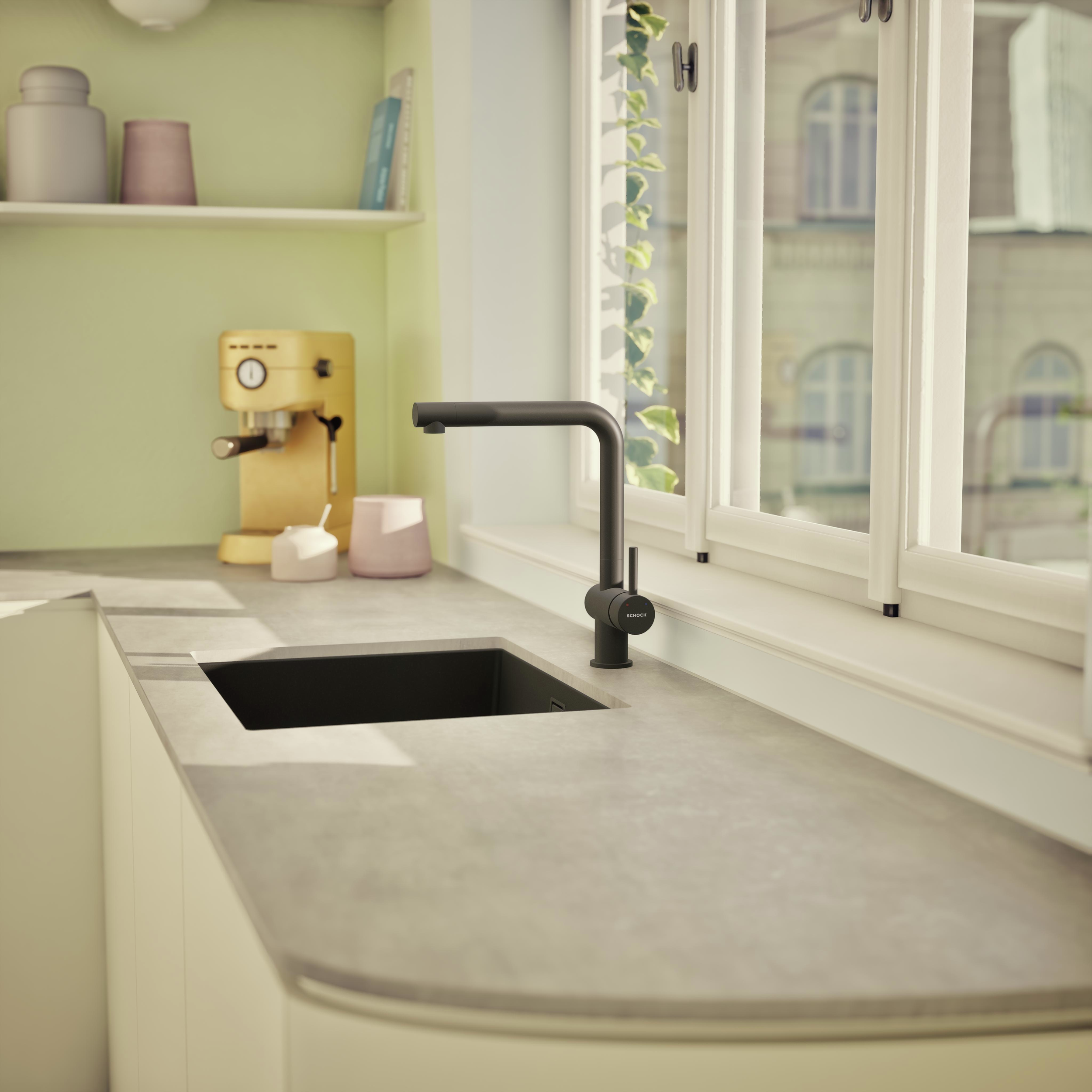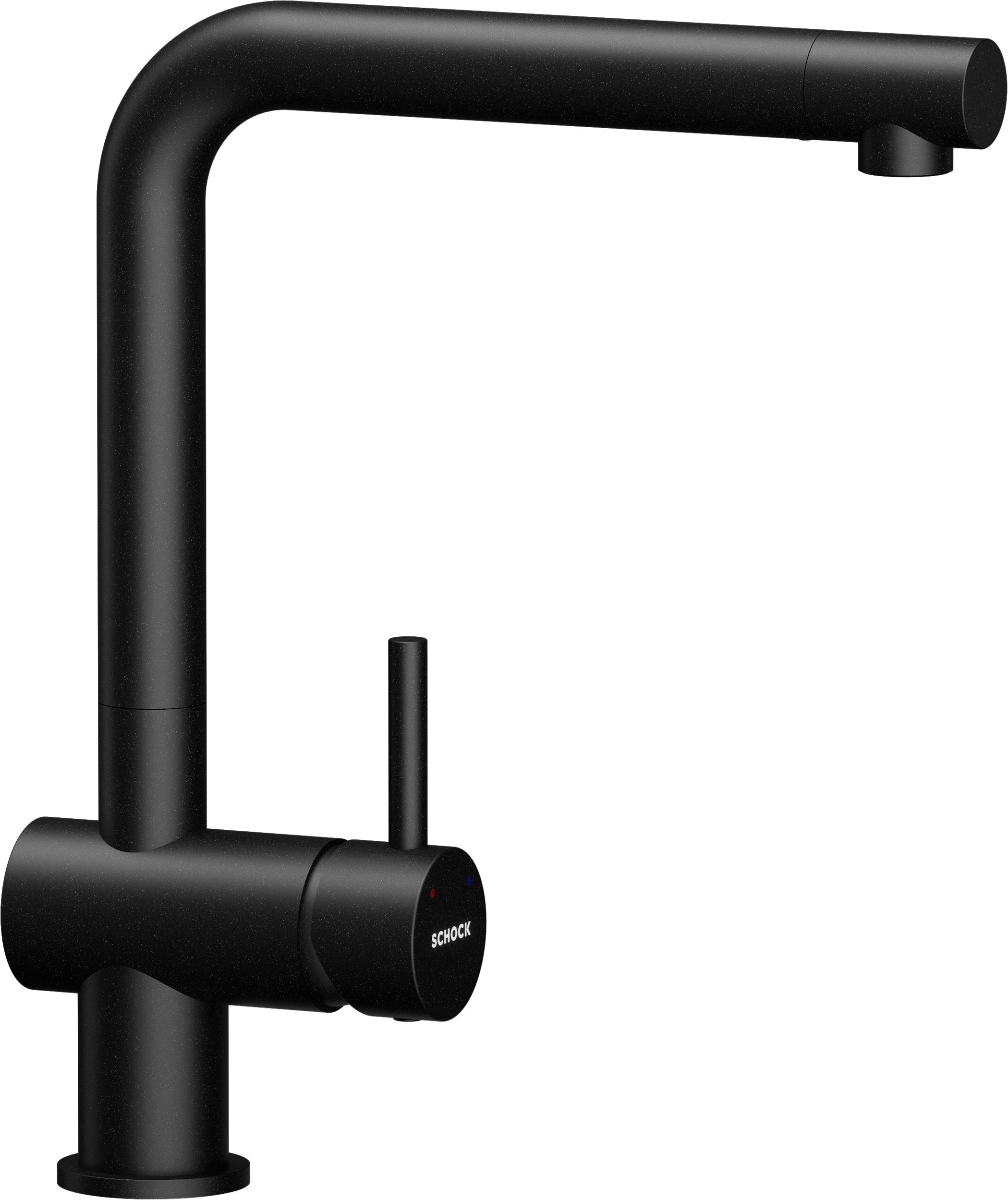 Nízkotlaková batéria SCHOCK Epos vyniká pravou polohou páky a zvýšenou výtokovou pozíciou.