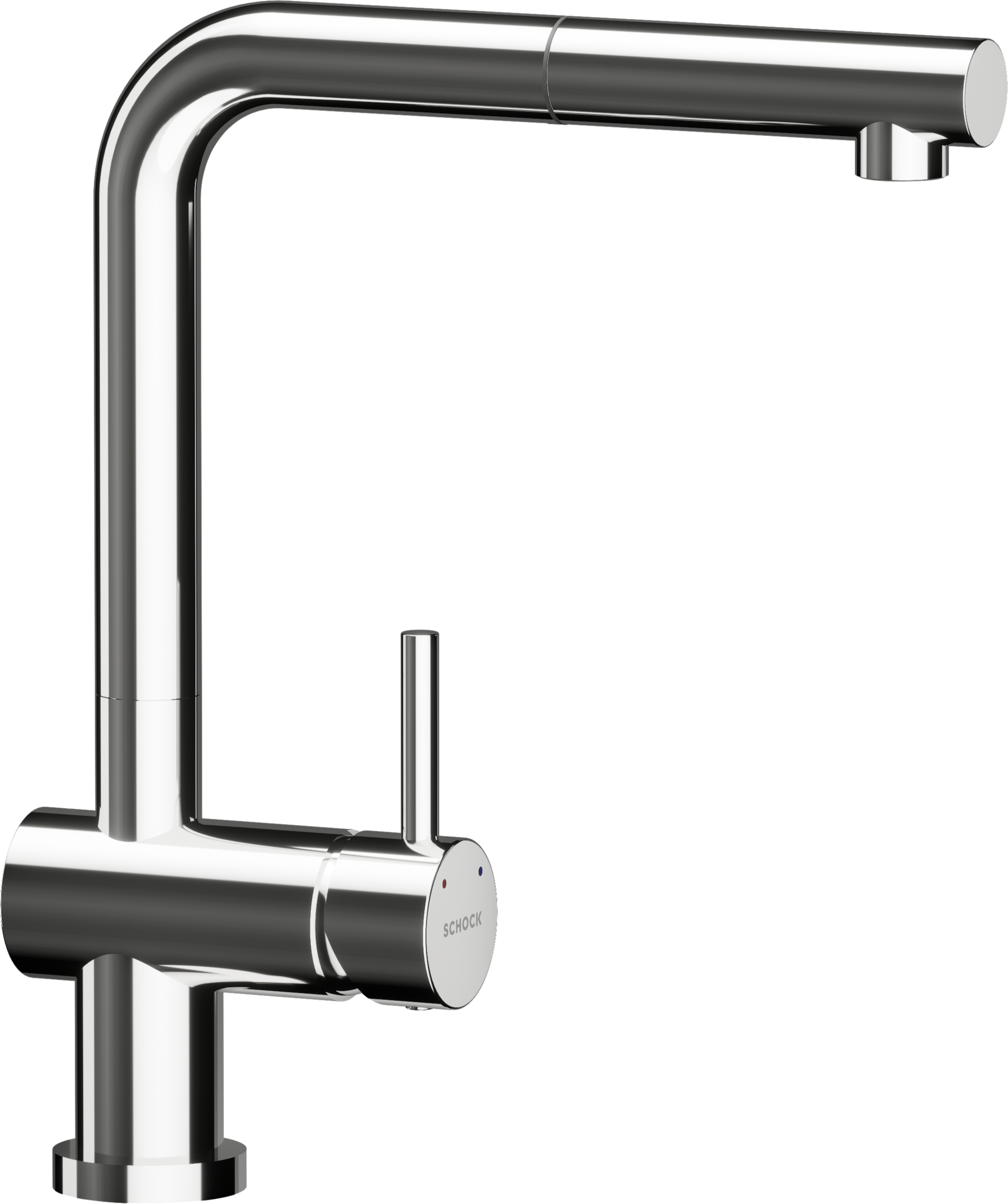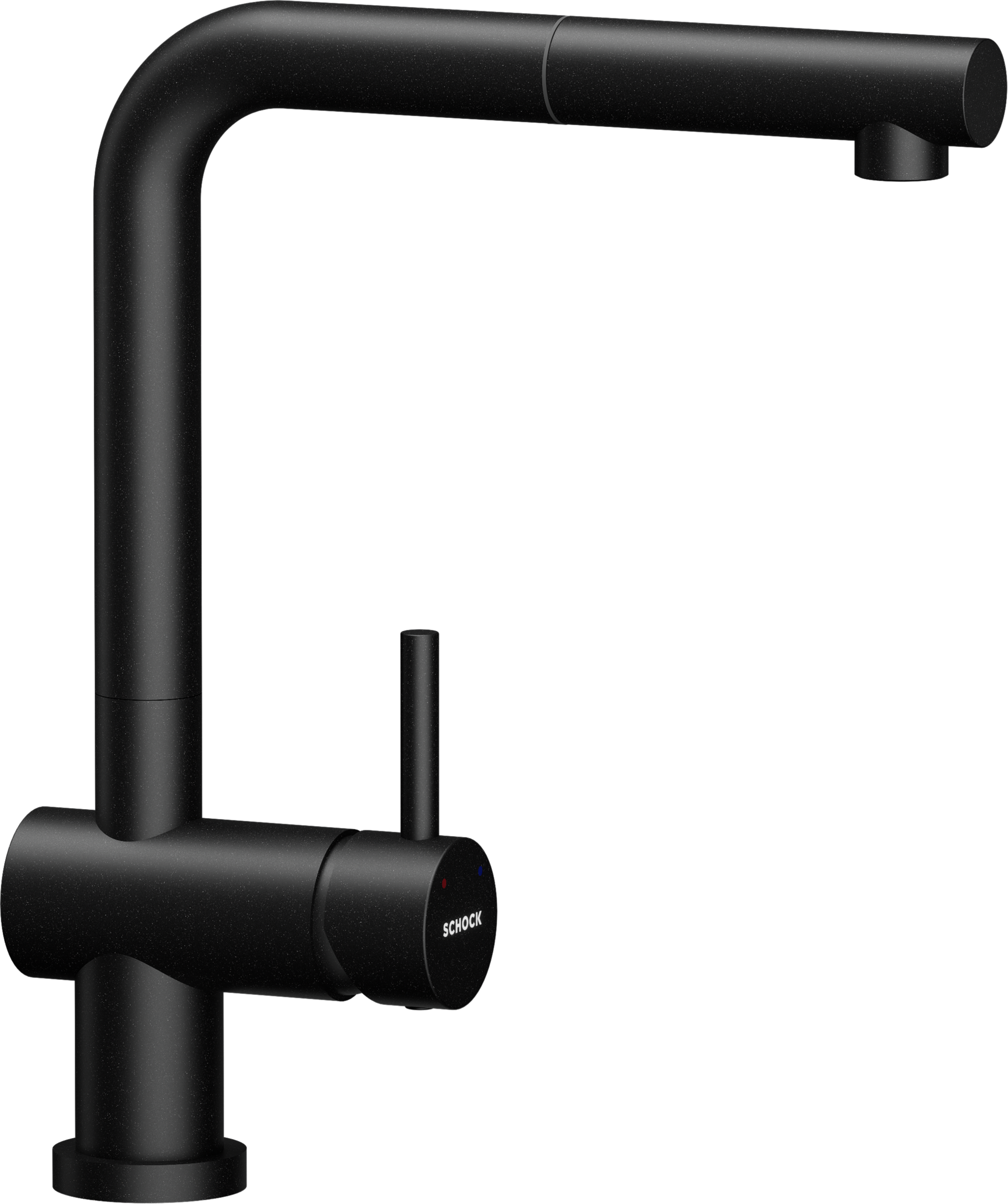 Nízkotlaková batéria SCHOCK Epos s vysúvacou výtokovou hadicou vyniká pravou polohou páky a zvýšenou výtokovou pozíciou.