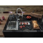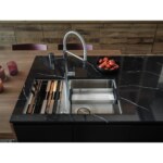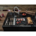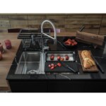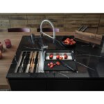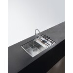 Nerezový drez Box Center. Jednoducho kombinovateľné, skvelé organizované. Box Center je inteligentné a vysoko praktické riešenie s krásnym a presvedčivým dizajnom. Dva jedinečne zlúčené drezy ponúkajú priestor pre skladovanie a sušenie často používaných kuchynských doplnkov, ktoré sú uložené priamo tam, kde ich najviac potrebujete. Cena zahŕňa: Doplnky: Miska, drevená prípravná doska, plastová prípravná doska, 3 nože vr. dreveného držiaku, odkvapkávač na riad, veko. Easy Click sitkový ventil 3 1/2 “ s prepadom a nerezovou krytkou ventilu. Sitkový ventil 3 1/2“ s prepadom. Sifón pre úsporu miesta 6/4“ s odbočkou na umývačku riadu. Otvor pre batériu ∅ 35 mm a pre excenter ∅ 35 mm.