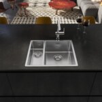 Nerezový drez Box. Cena zahŕňa: 2× Sitkový ventil 3 1/2“ s prepadom. Sifón pre úsporu miesta 6/4“ s odbočkou na umývačku riadu. Drez pre hornú montáž s plochým okrajom, do roviny a pre spodnú montáž. Fixačné príchytky Fast-Fix.