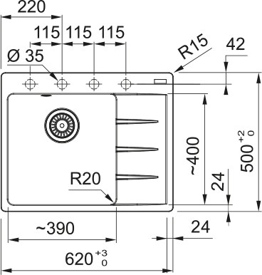 Fragranitový drez Centro. Cena zahŕňa: Vymedzovaciu podložku pre montáž kuchynskej batérie. Sitkový ventil 3 1/2“ s prepadom. Sifón pre úsporu miesta 6/4“ s odbočkou na umývačku riadu. 4 Miesta pre vyvŕtanie otvoru. Možnosť umiestniť dávkovač saponátu. Fixačné príchytky Fast-Fix. Moderné línie, jemne zaoblené hrany, k okraju miznúcej drážky, tenký profil. Svieži a atraktívny design.