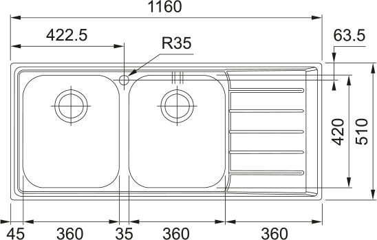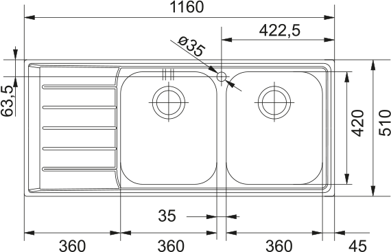 Nerezový drez Neptun. Cena zahŕňa: Sitkový ventil 3 1/2“ s prepadom. Sitkový ventil 3 1/2“. Sifón pre úsporu miesta 6/4“ s odbočkou na umývačku riadu. Otvor pre batériu ∅ 35 mm.