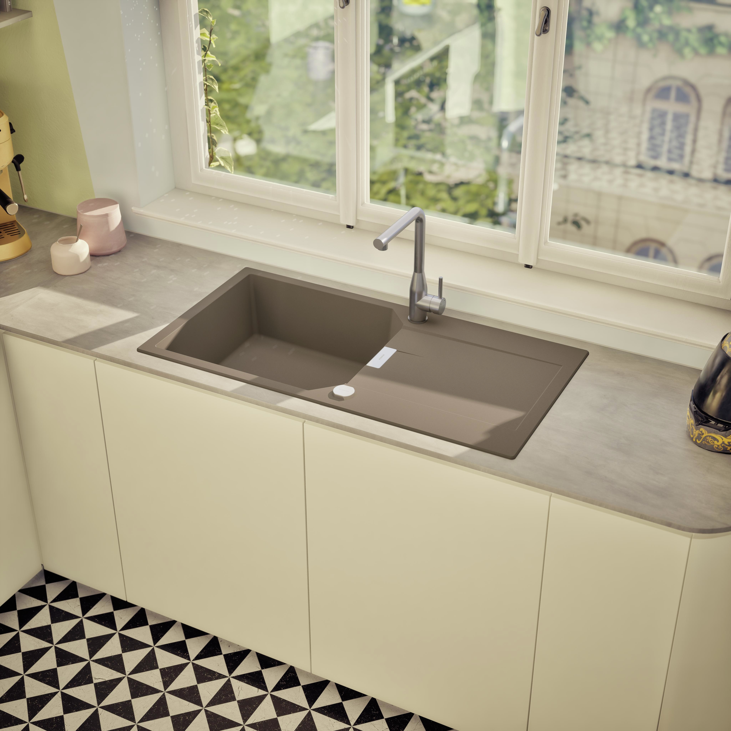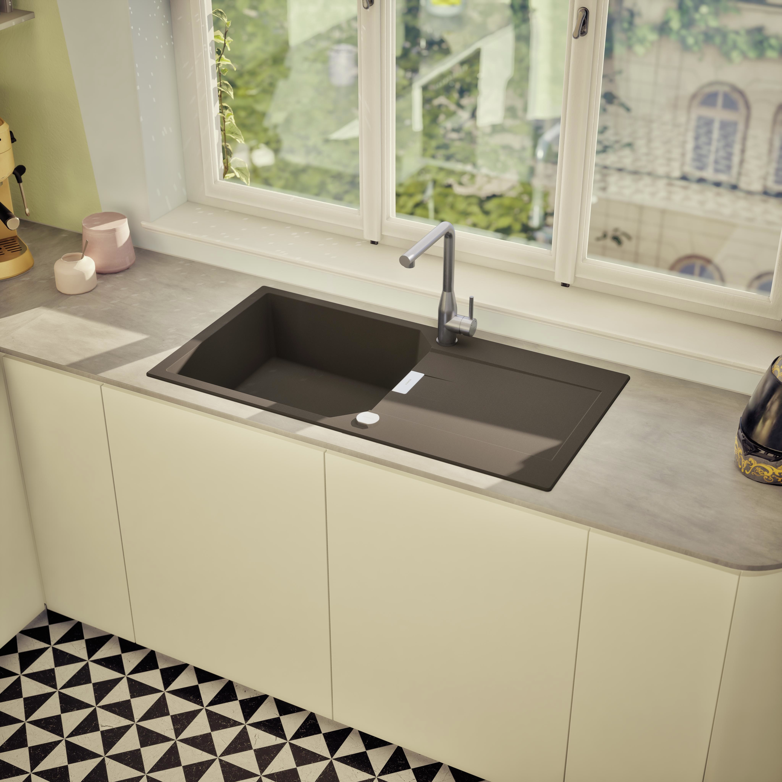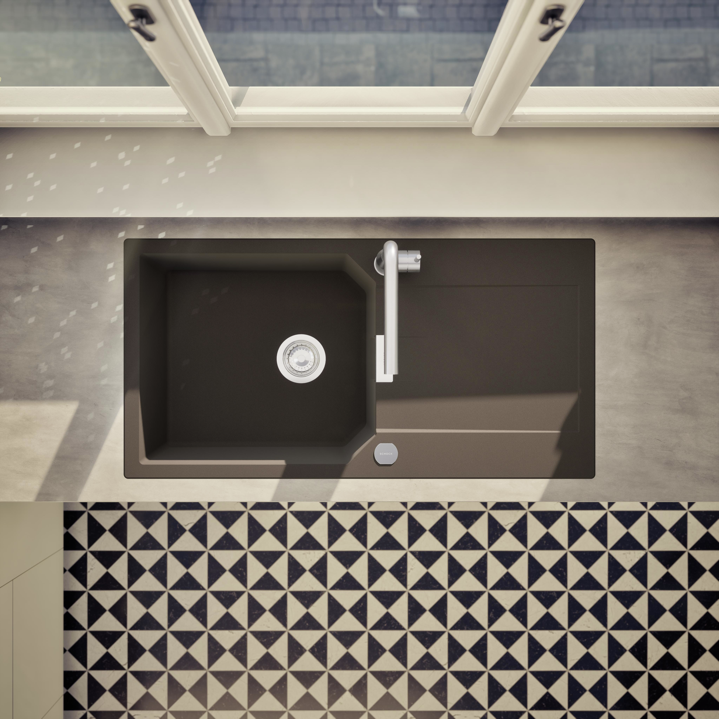 Priestranný kuchynský drez SCHOCK Manhattan D-100L z materiálu CRISTALITE® poskytuje extra objem vaničky pre veľké hrnce v umývacom priestore.