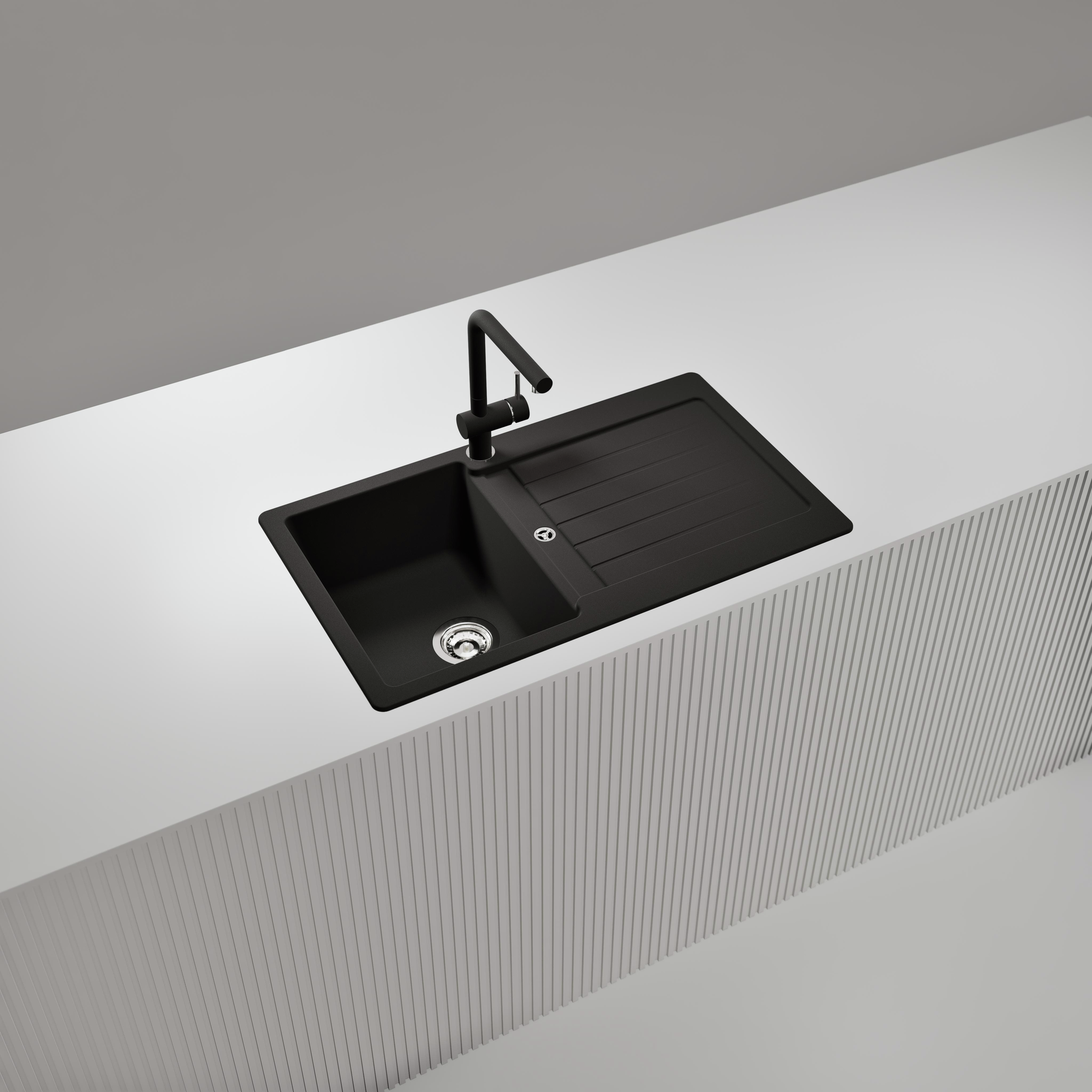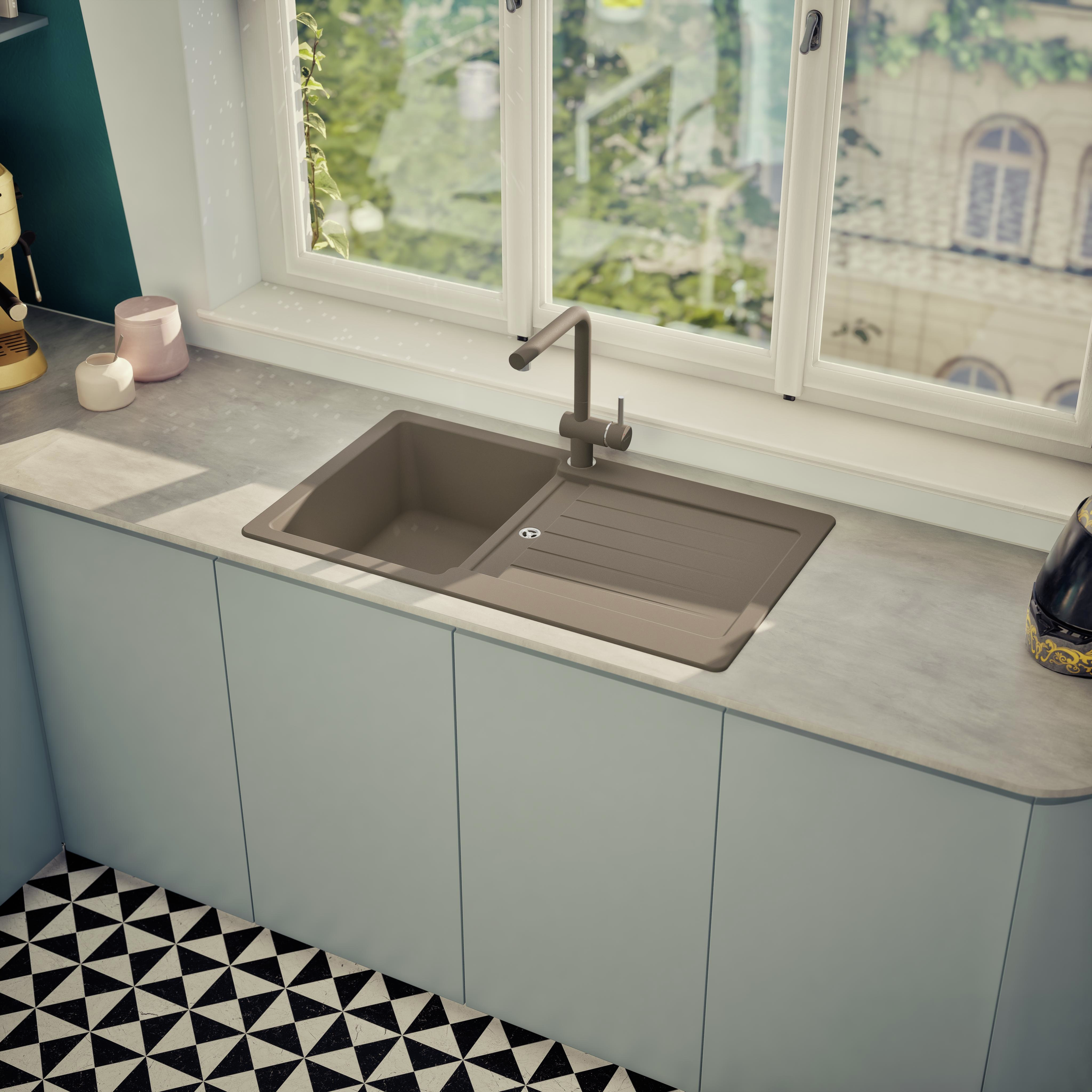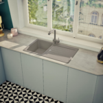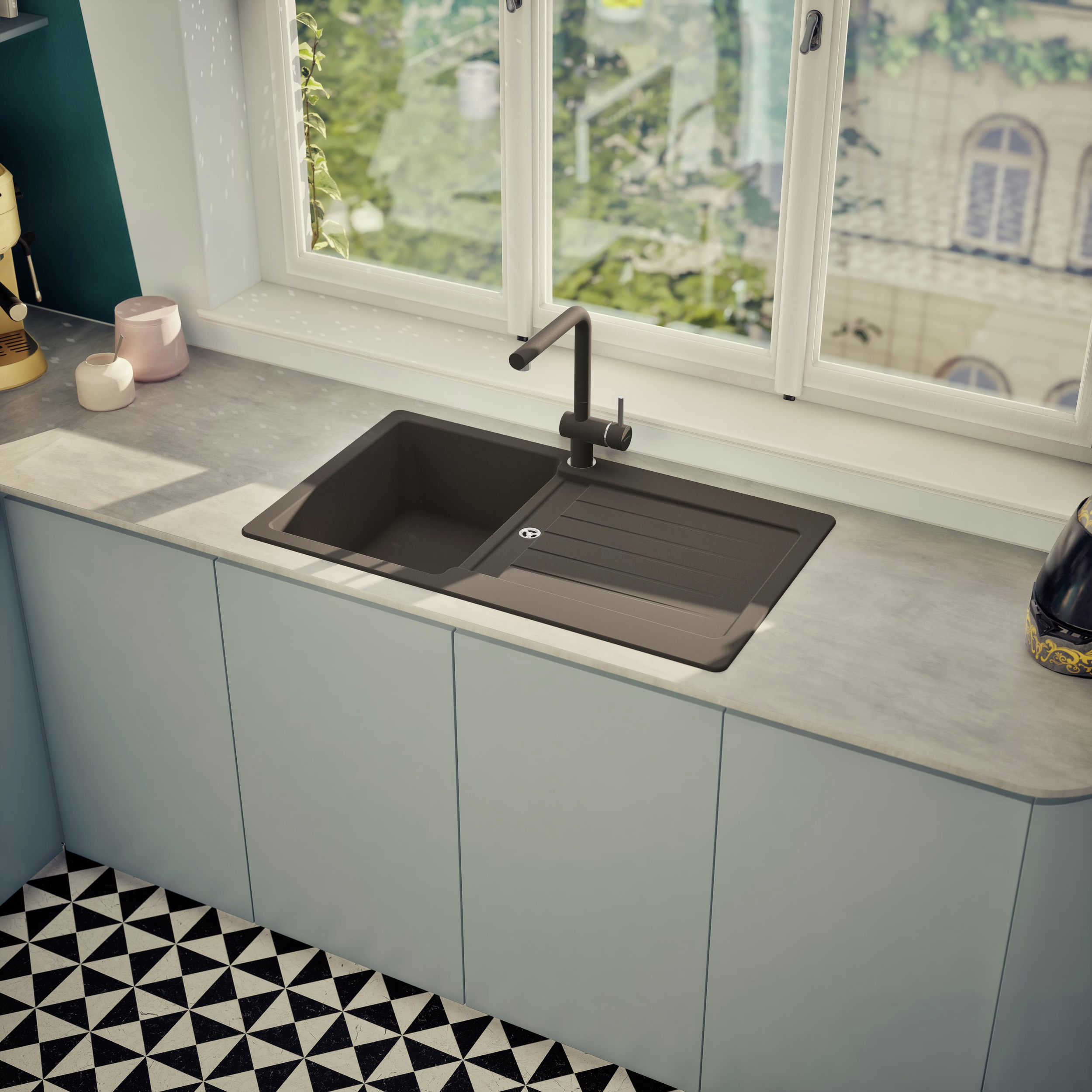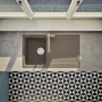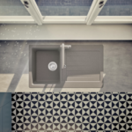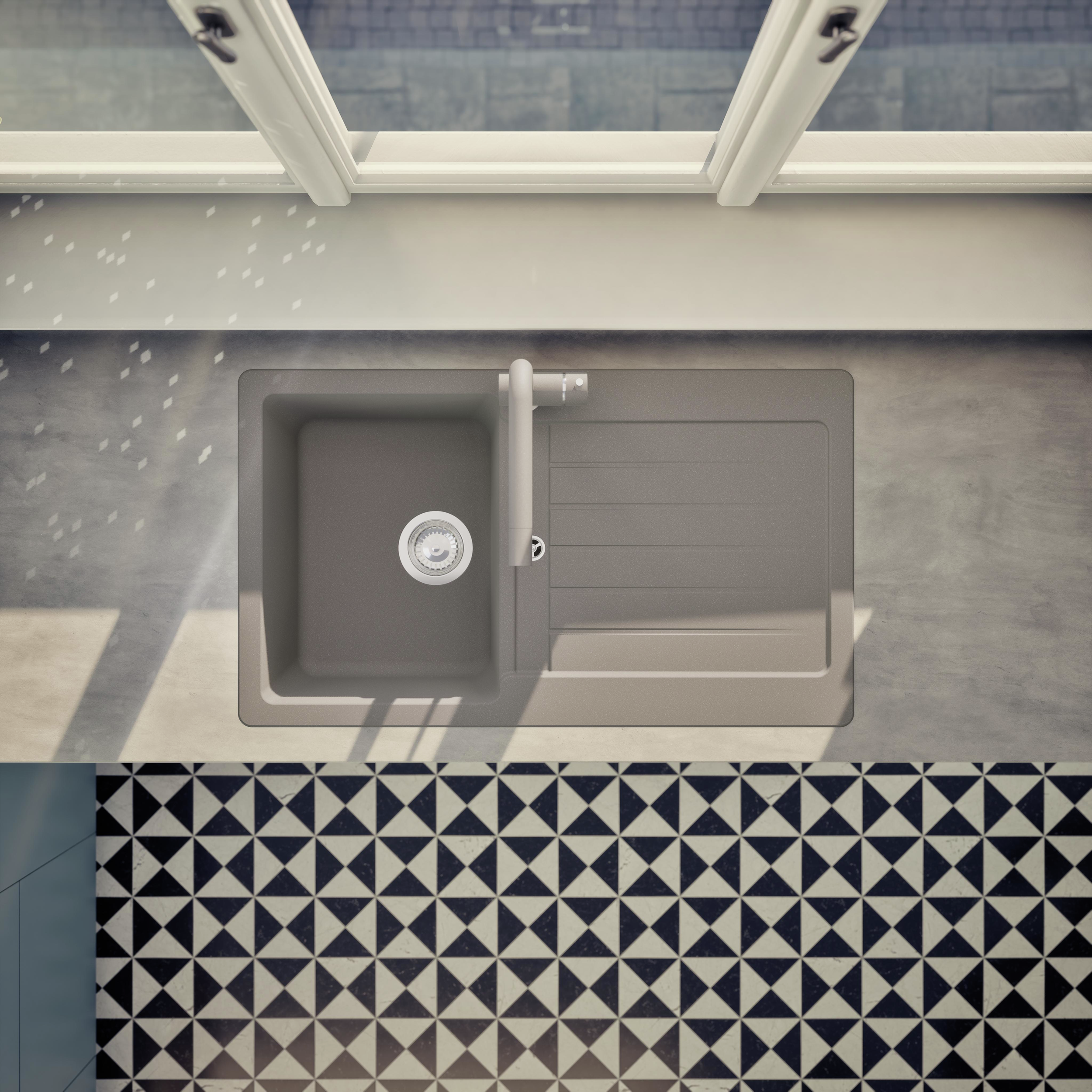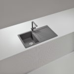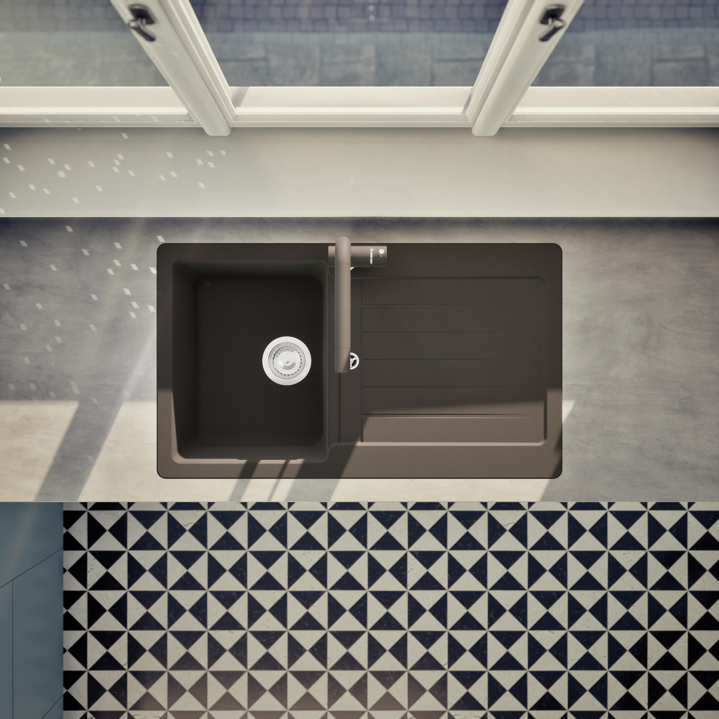 Moderný granitový drez SCHOCK Typos D-100 z materiálu CRISTALITE® má ako praktické plus dodatočný znížený odtok.