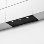 Vstavaný odsávač pár Box Flush Basic. Prevedenie Matná čierna (NCS S 9000-N). Energetická trieda B. Tlačidlové ovládanie. 3 Stupne výkonu. Intenzívny stupeň.