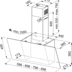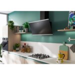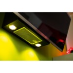 Komínový odsávač pár Evo Plus. Prevedenie čierné sklo, RAL 9005 + 2 Nerezové prúžky. Energetická trieda A+. Senzorové ovládanie. Štrbinové odsávanie. 3 Stupne výkonu. Intenzívny stupeň. Dobeh. Sound Pro. Čierny teleskopický komín je súčasťou dodávky.