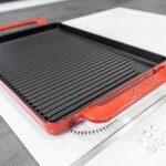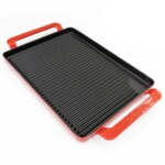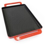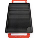 Liatinová grilovacia doska v červenom prevedení so vyvýšeným okrajom a s vystúpeným vzorom (rebrovaním) pre typ varných dosiek s horiZone. Vyrobená z masívnej liatiny povrchovo smaltovaná, umožňuje pečenie rôznych pokrmov na rovnomernej ploche, je možné pripraviť napríklad mäso, ryby, zeleninu alebo syry. Grilovacia doska si udržuje vysokú teplotu a dodáva jedlu typickú grilovanú chuť a arómu. Rozmery (VxŠxH): 2,5 x 24 x 42 cm