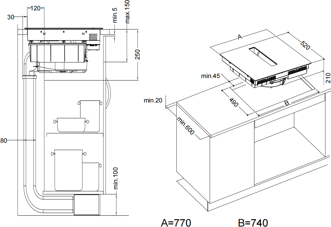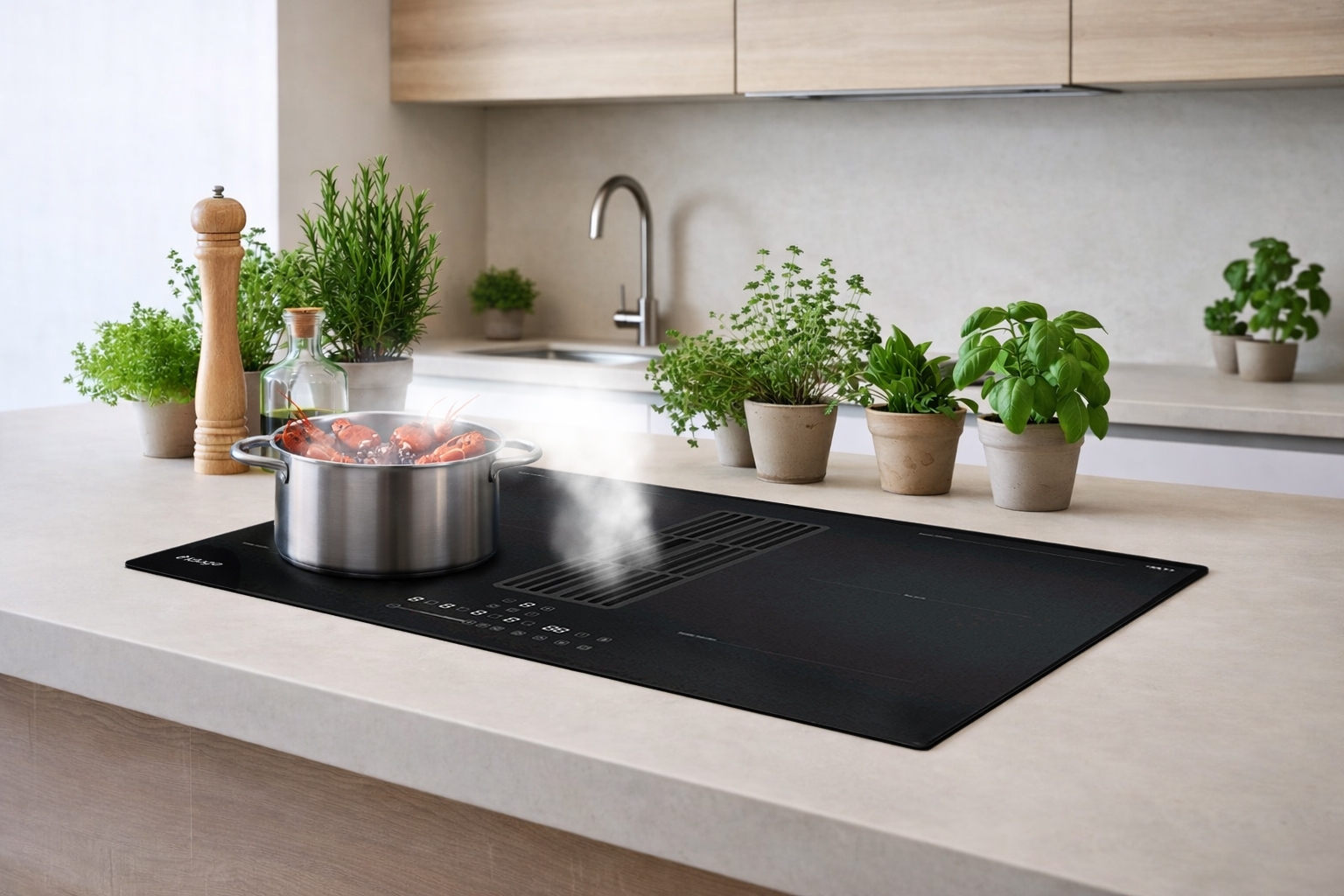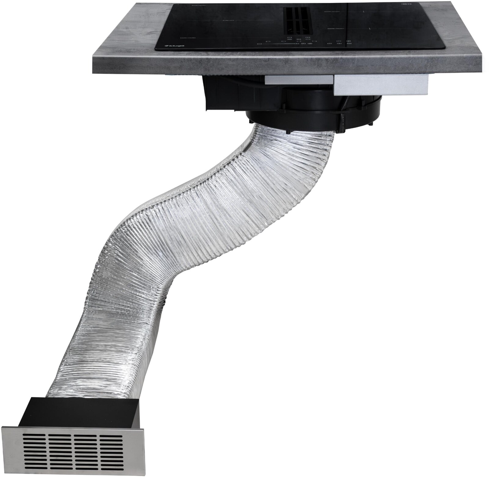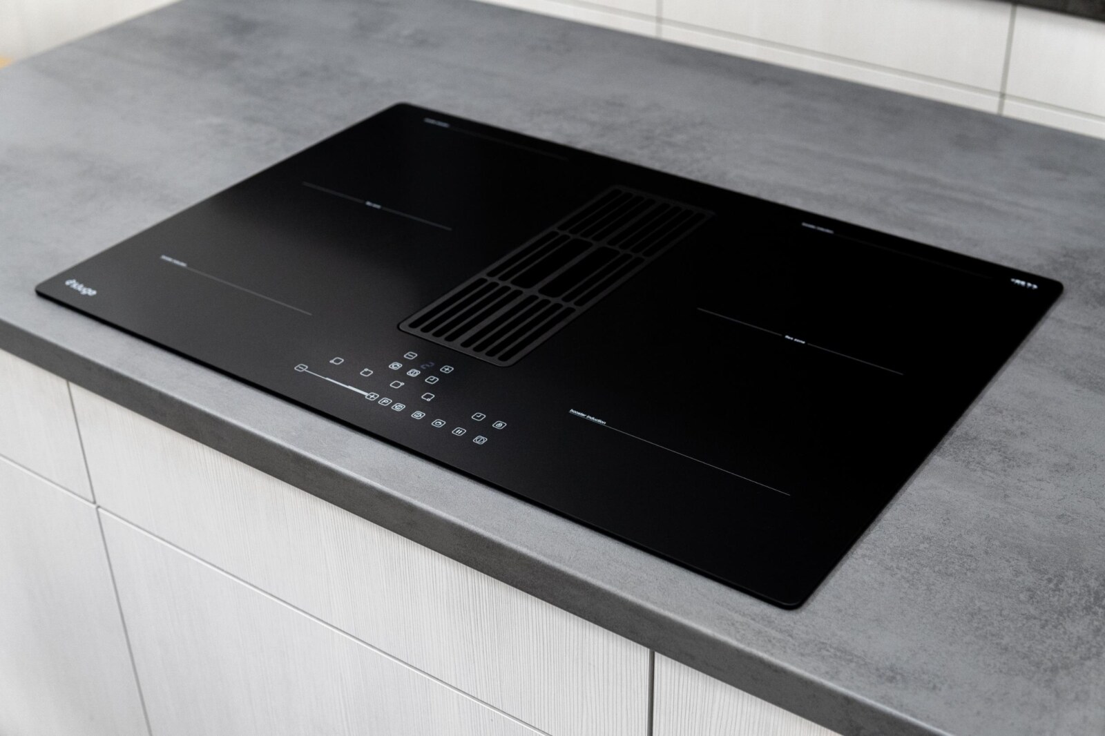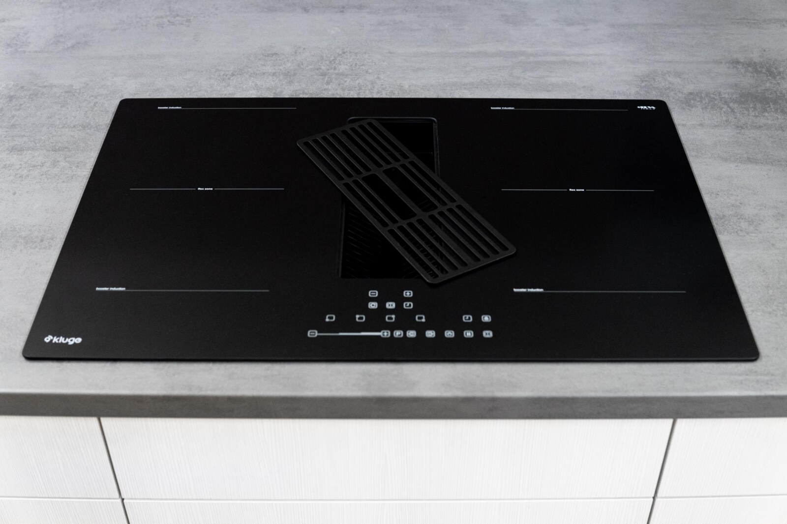 Indukčná varná doska s integrovaným odsávačom pár, šírka 80 cm; Povrch z matného čierneho skla s bielym LED podsvietením; Dotykové ovládanie s plynulým posuvníkom výkonu Mono Slider Control; 9 stupňov nastavenia výkonu varných zón vrátane Boost; 4 varné zóny: predná ľavá a pravá 190×190 mm /1,5/Boost 2,0 kW, zadná ľavá a pravá 190×190 mm /2,0/Boost 2,8 kW; 2x Flexi zóna; Integrovaný odsávač s BLDC motorom 170 W; Max. výkon odťahu: 600 m³/h; Hlučnosť 77 dB(A); 3 funkcie varenia a funkcia Smart pause – pozastavenie výkonu všetkých zapnutých zón; Časovač s možnosťou nastavenia až do 99 minút; Upozornenie na zvyškové teplo a detská poistka; Detekcia riadu a automatická ochrana vypnutia; Súčasťou balenia je flexibilné potrubie KVSD112, 200×80 mm, hliník, 0,3-2 m; Celkový príkon: 7,37 kW; Rozmery (VxŠxH): 20 x 77 x 52 cm.