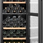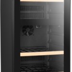 Voľne stojaca dvojzónová servírovacia vinotéka s 2 nezávislými chladiacimi zónami; Celková kapacita 108 fliaš s objemom 75 cl (horná zóna 49 fliaš, spodná zóna 59 fliaš); Rozsah nastavenia teploty: 5~20 °C pre hornú zónu a 5~20 °C pre spodnú zónu; Sklenené dvere s čiernym rámom a zapustenou rukoväťou; 2 vrstvy tvrdeného skla s čiernym tónovaním a UV filtrom; Čierne telo vinotéky; Elektronická regulácia teploty; Dotykové ovládanie s LED displejom v bielej farbe; Biele LED osvetlenie s vypínačom; Automatické odmrazovanie; Systém aktívnej ventilácie v oboch zónach; Antivibračný systém; Zvukový a vizuálny signál zvýšenia teploty; 5 vysúvacích drôtených políc s dreveným čelom; 4 výškovo nastaviteľné nožičky; Dĺžka napájacieho kábla 200 cm; Energetická trieda G; Klimatická trieda N; Ročná spotreba energie: 153 kWh; Hlučnosť 38 dB(A); Hmotnosť 48 kg; Rozmery (VxŠxH): 121,6 x 49,5 x 59,6 cm.